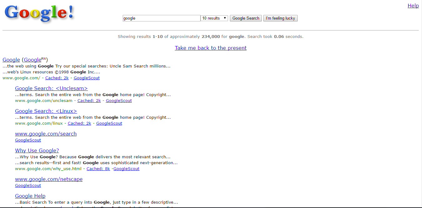 Akan memperlihatkan tampilan hasil pencarian Google Search yang digunakan Google saat pertama kali diluncurkan pada tahun 1998.