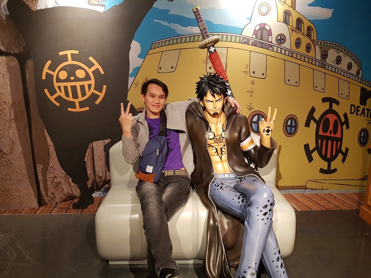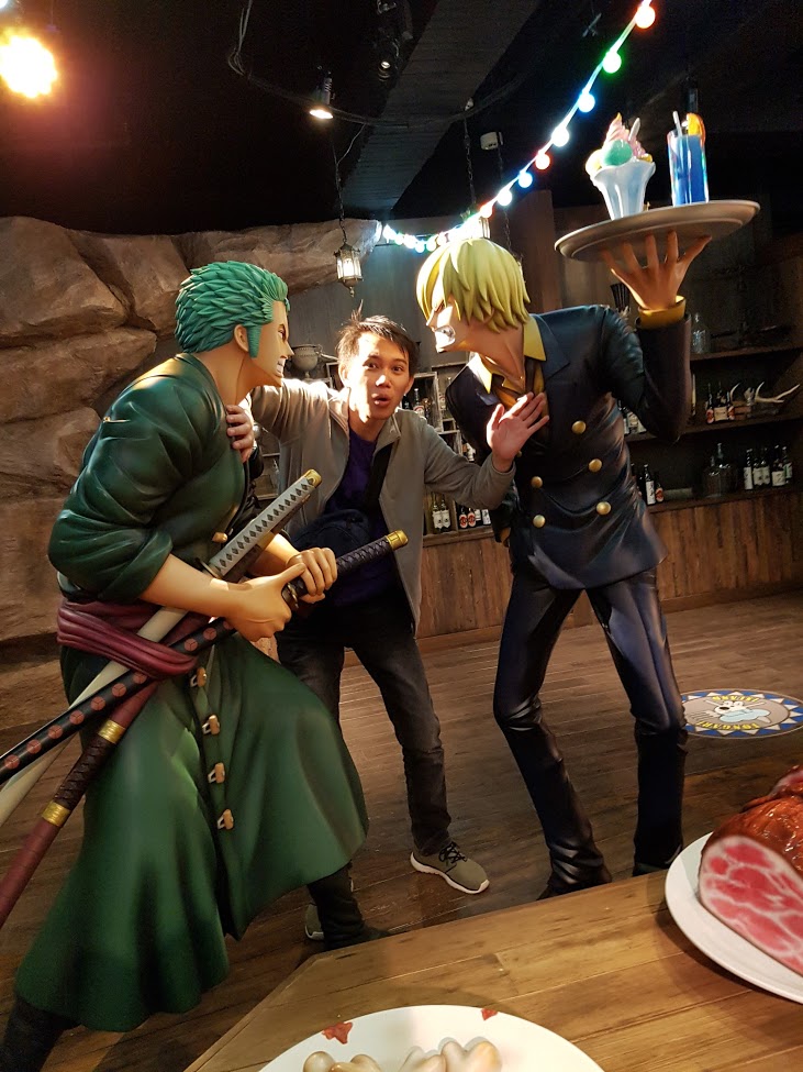 Begitu memasuki One Piece Theme Park, gw disambut dengan ada komik yang interaktif dan beberapa patung karakter One Piece berukuran seperti aslinya. Di lantai atas, terdapat teater dan beberapa zona permainan seperti Zoro’s Soul of Edge, Nami’s Casino House, Robin’s Finding Ponegliff, Brook’s Horror House, Usopp’s Road to Sogeking, dan sebagainya. Pas gw di sana, mereka lagi merayakan anniversary One Piece Theme Park, jadilah mereka bagi-bagi hadiah untuk yang bisa memenangkan permainan tertentu.