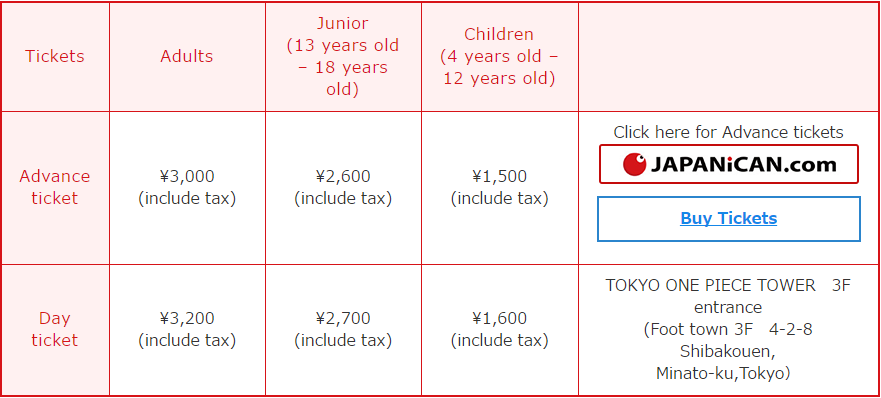 Harga tiket masuk One Piece Theme Park (Tokyo One Piece Tower, 2016) |