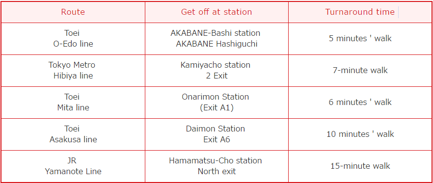 - Mukougaoka Yuen station (Odakyu line) dilanjutkan dengan berjalan kaki 16 menit, atau naik bus umum.